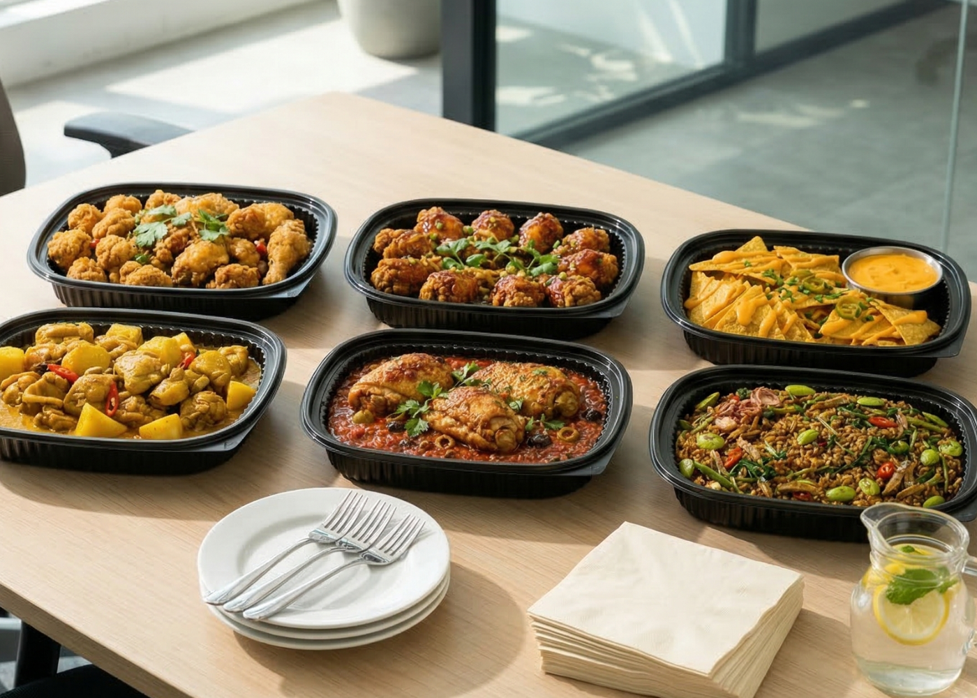 A bold mix of bang bang chicken drumlets, crispy fish goujons with tartare sauce, and citrus miso potato salad.